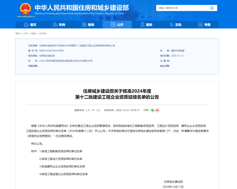 近日,住房城乡建设部正式宣布了《关于批准2024年度第十二批建设工程企业资质延续名单的通告》 。省建筑设计院建筑行业甲级、景物园林工程设计专项甲级、市政行业(给水工程)专业甲级、市政行业(热力工程)专业甲级资质通过批准延续 。